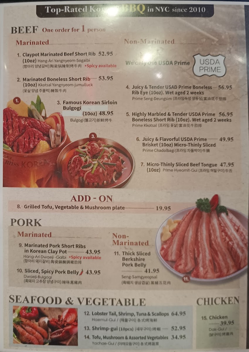 miss KOREA BBQ in the heart of New York’s Koreatown offers an exceptional Korean barbecue experience, blending premium cuts with authentic flavors. Their grilling platters, such as the Signature Beef Claypot Aged Beef Galbi and the Marinated Claypot Aged Beef Bulgogi, highlight top-tier aged beef, seasoned to perfection and grilled by attentive staff. The tender꽃살 (boneless short ribs) is especially praised for its juicy texture and rich taste. Complementing the grills, shared dishes like the savory Volcano Ramen and the comforting GalbiJjim elevate the dining experience, bringing a harmonious balance of surf, turf, and traditional Korean flavors.